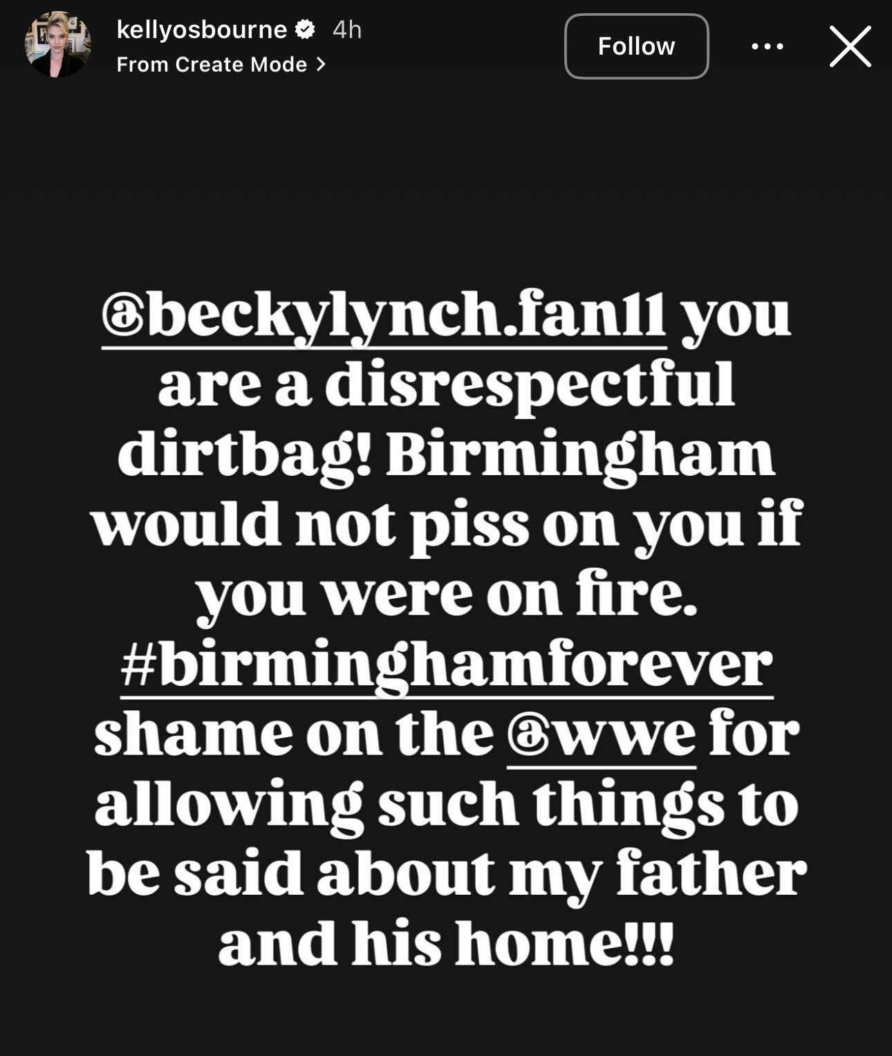 “Becky Lynch, you are a disrespectful dtbag! Birmingham would not p*ss on you if you were on fire.” She tagged, albeit to a fan account, not Becky’s actual handle, and didn’t stop there: