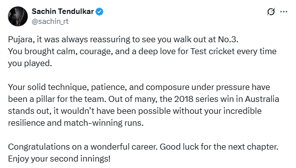 "Pujara, it was always reassuring to see you walk out at No.3. You brought calm, courage, and a deep love for Test cricket every time you played. Your solid technique, patience, and composure under pressure have been a pillar for the team. Out of many, the 2018 series win in Australia stands out, it wouldn’t have been possible without your incredible resilience and match-winning runs. Congratulations on a wonderful career. Good luck for the next chapter. Enjoy your second innings!" wrote Tendulkar on X.