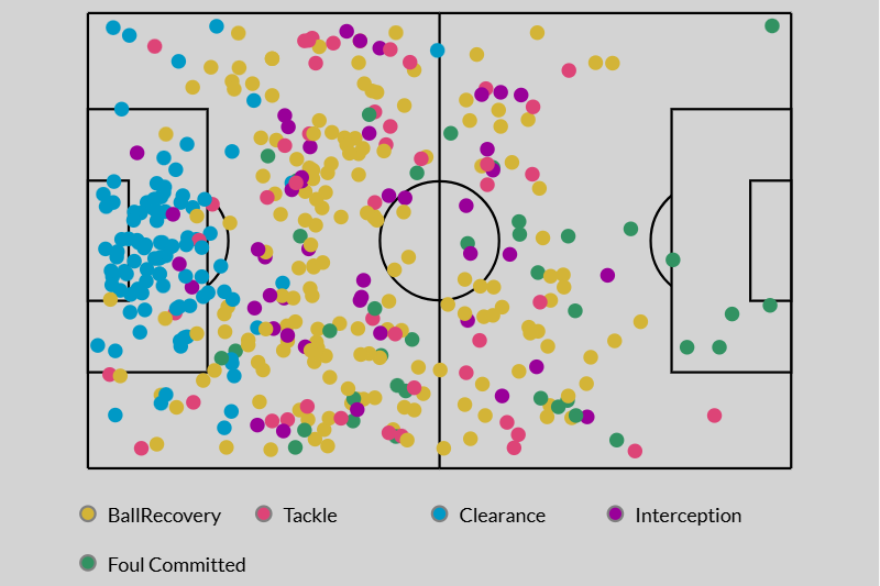 His defensive action map shows a busy midfielder, although it's partly influenced by him playing a ton of the first half of the 2024-25 season at center back.